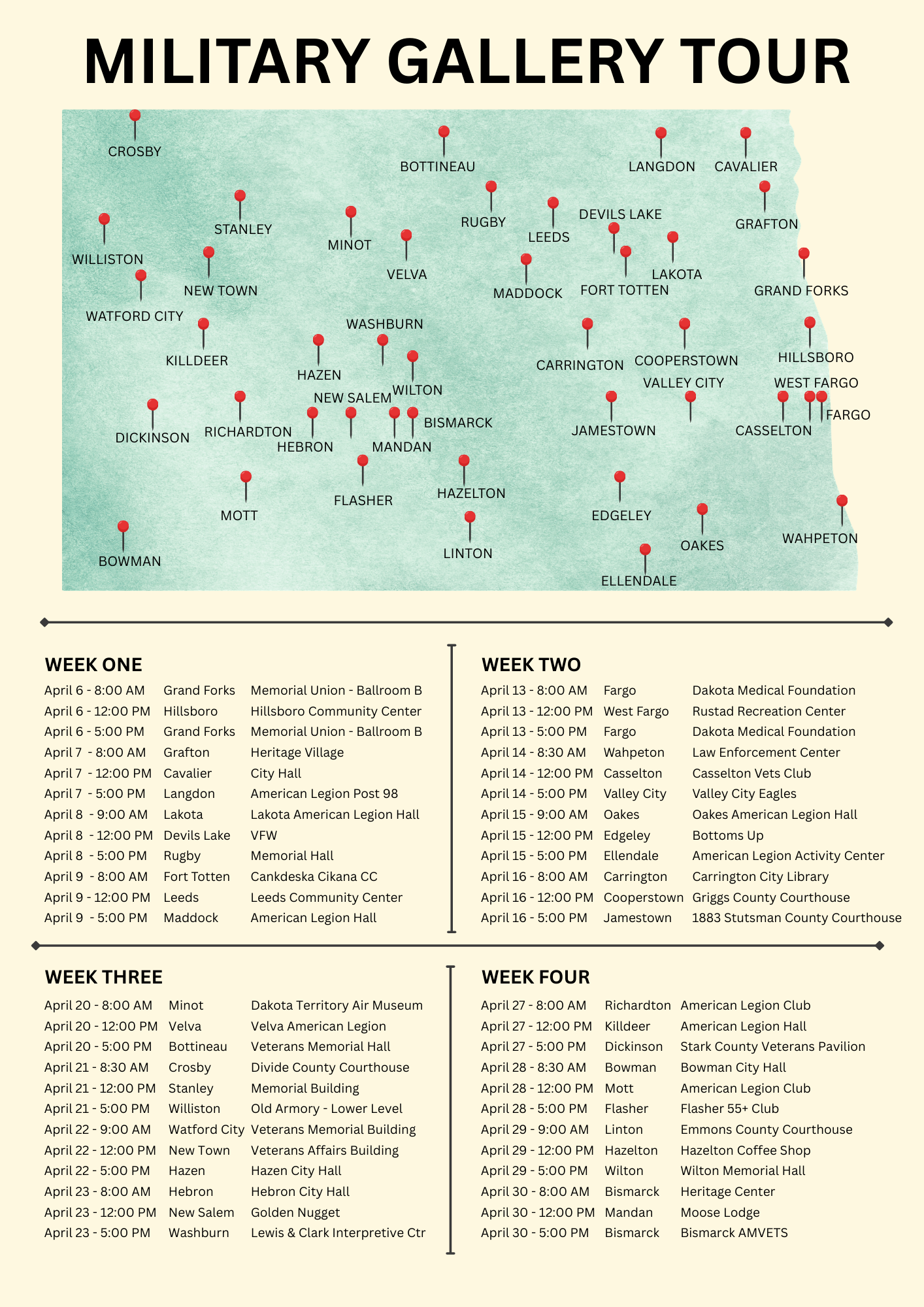 Lennon, executive director for the State Historical Society of North Dakota Foundation, said the 48-stop tour across the state – kicking off in Grand Forks on April 6 – will inform communities about the new Military Gallery and connect them with ways to make donations or get involved.