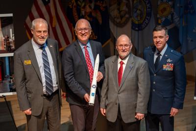 From left: North Dakota State Historical Society Foundation Executive Director Dale Lennon, U.S. Senator Kevin Cramer, State Historical Society Director Bill Peterson and Brig. Gen. Mitchell Johnson, the North Dakota National Guard's adjutant general, stand with a model of the Minuteman III ICBM that will be on display in the state's Military Gallery starting in late 2027.